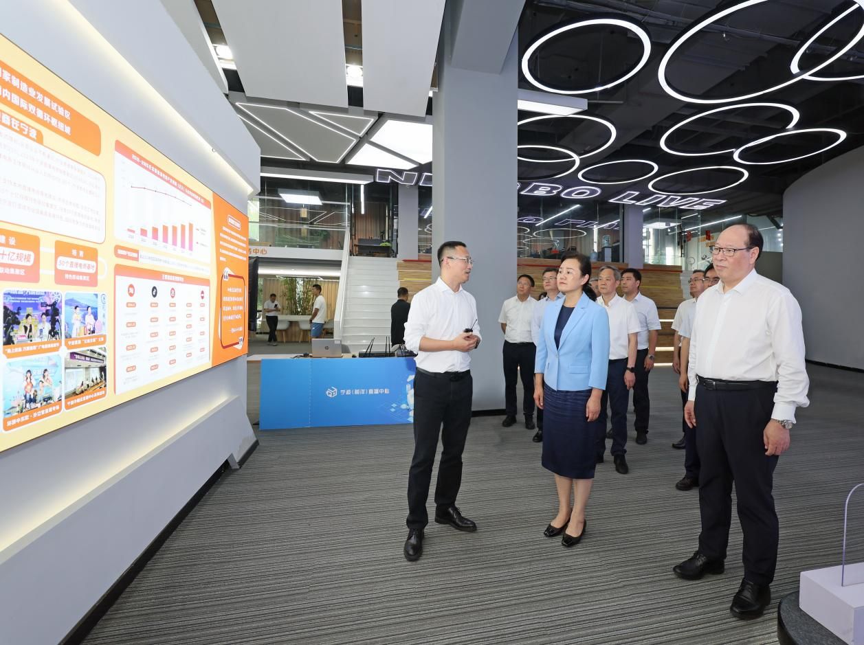 6月19日下午,重慶市委常委、萬州區(qū)委書記盧紅率考察團到寧波廣電集團旗下寧波(前洋)直播中心,調(diào)研直播產(chǎn)業(yè)服務(wù)平臺打造、直播行業(yè)及互聯(lián)網(wǎng)黨建、對口協(xié)作生態(tài)平臺構(gòu)建、跨境直播服務(wù)平臺等工作,考察交流以新業(yè)態(tài)新模式推動產(chǎn)業(yè)高質(zhì)量發(fā)展的實踐做法。浙江省委常委、寧波市委書記彭佳學(xué),寧波市委常委、市委秘書長奚明,市政府黨組成員、寧波經(jīng)濟技術(shù)開發(fā)區(qū)黨委會主任葉苗及江北區(qū)委書記張國鋒,寧波廣電集團黨委書記、總裁李可等陪同。