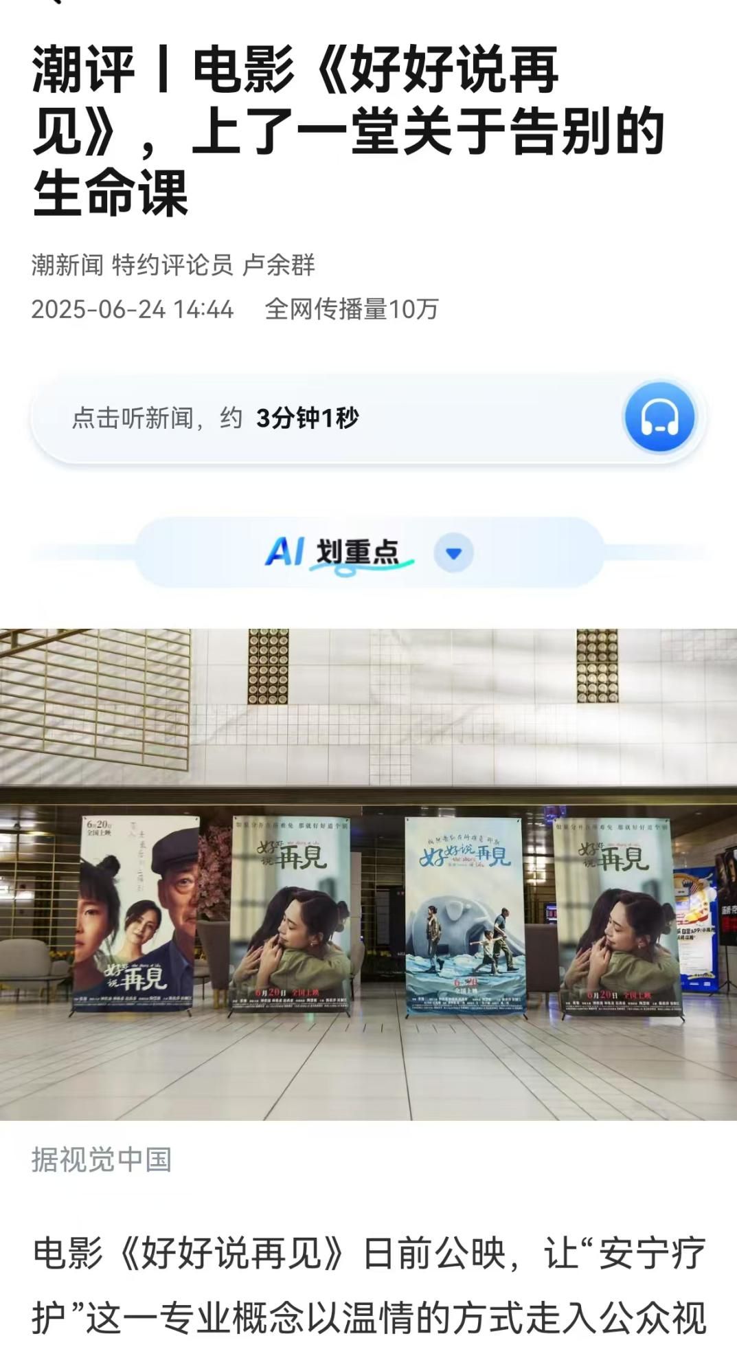 由寧波廣電集團旗下寧波影視藝術有限責任公司領銜出品的電影《好好說再見》自今年6月20日公映以來,得到了業(yè)界專家、觀眾和機構等的高度認可。尤其是全國公益機構、安寧療護組織、志愿者組織以及醫(yī)療機構,自發(fā)地組織包場觀影,并圍繞“安寧療護”主題展開映后交流,逐步擴大影片的影響力。