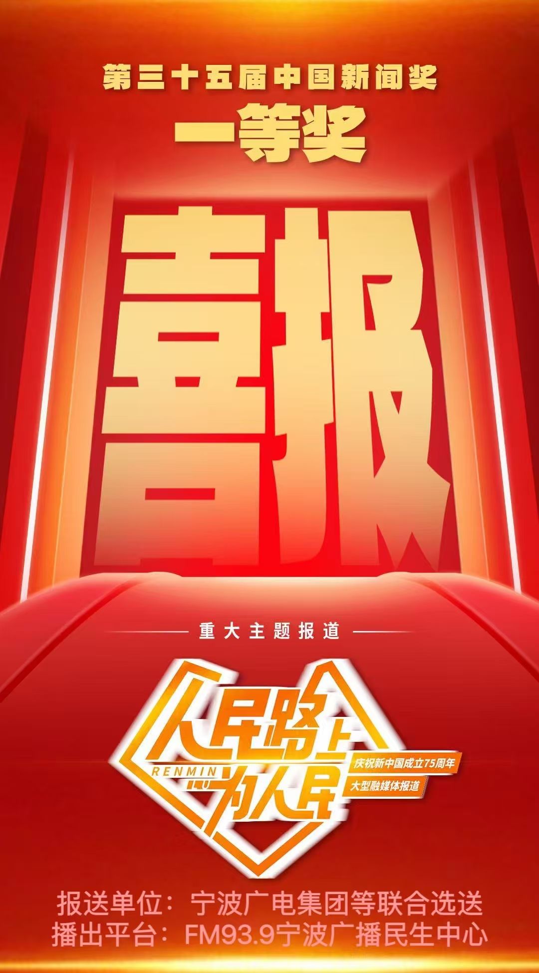 11月5日,第35屆中國新聞獎評選結(jié)果揭曉,來自全國各級各類媒體的377件作品獲中國新聞獎,其中特別獎4件、一等獎74件、二等獎113件、三等獎186件。其中,寧波廣電集團參與創(chuàng)作的重大主題報道《人民路上為人民》榮獲中國新聞獎一等獎。