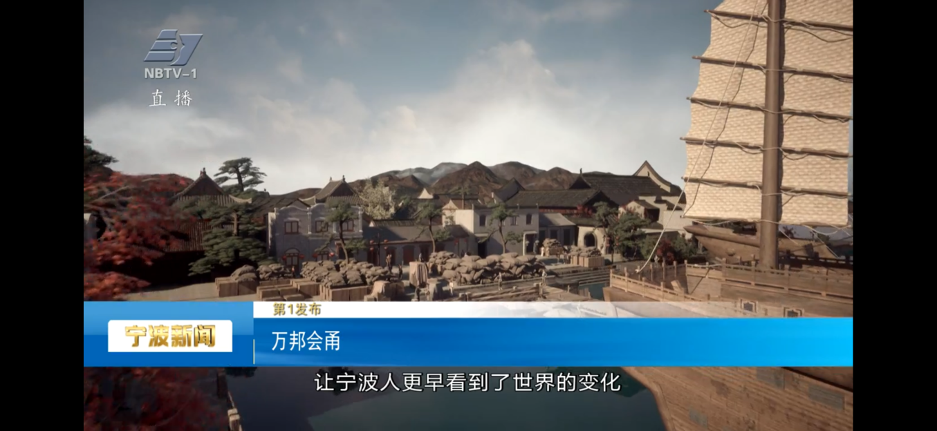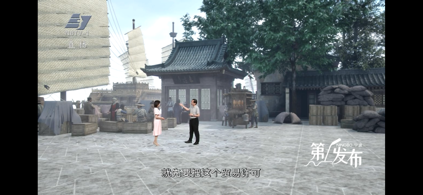 XR打造的虛擬場景加持是這一系列的一大亮點(diǎn),實(shí)現(xiàn)多媒介融合,“時(shí)空雙線敘事”?。?每期節(jié)目前半部分在海洋文化地標(biāo)取景,結(jié)合季節(jié)變化,增強(qiáng)視覺美感;“下半場”?XR場景的加入,?在實(shí)景基礎(chǔ)上疊加虛擬元素,如建筑遺跡,形成了“現(xiàn)實(shí)與歷史”的對話。其中第四期“潮起三江千帆競”中,XR技術(shù)復(fù)原了兩宋時(shí)期寧波港的重要組成部分——來安門。隨著發(fā)布人講述,這道“門”也動了起來,徐徐打開。當(dāng)時(shí)的寧波港碼頭在屏幕里重生,主持人和發(fā)布人一同體驗(yàn)海上貿(mào)易流程,從貨物裝卸到海關(guān)驗(yàn)貨,沉浸式感受古代港口的商業(yè)活力。這期節(jié)目獲發(fā)布人肯定,XR場景使歷史敘事更具說服力。