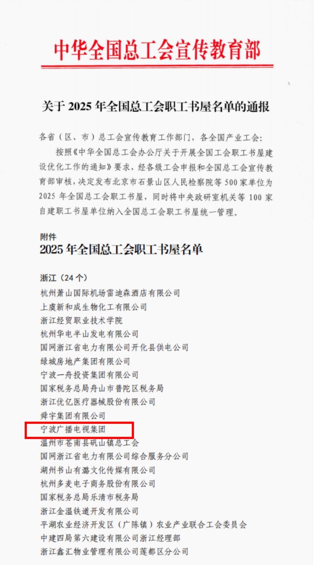 繼2024年10月獲評“浙江省職工書屋”后,2026年2月寧波廣電集團(tuán)職工書屋又入選“2025年全國總工會職工書屋”。這表明寧波廣電集團(tuán)在職工文化建設(shè)方面得到上級工會組織的認(rèn)可。