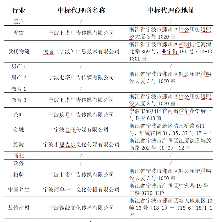 因發(fā)展需要,現(xiàn)向社會招募(招標(biāo))2026行業(yè)廣告代理。招募行業(yè)包括醫(yī)療、餐飲、貨代物流、房產(chǎn)(房產(chǎn)1和房產(chǎn)2)、教育(教育1和教育2)、茶葉、金融、旅游、商業(yè)、政務(wù)、招聘、中醫(yī)養(yǎng)生、裝修建材等十三個行業(yè)。