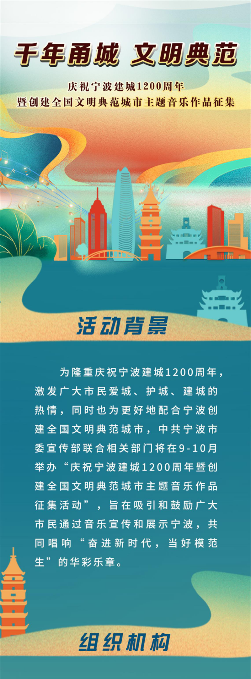 9月8日,由中共寧波市委宣傳部、寧波市文明辦、寧波廣播電視集團(tuán)、寧波市音樂(lè)家協(xié)會(huì)共同指導(dǎo)、中國(guó)新鄉(xiāng)村音樂(lè)發(fā)展中心主辦的“慶祝寧波建城1200周年暨創(chuàng)建全國(guó)文明典范城市主題音樂(lè)作品征集活動(dòng)”啟動(dòng)。