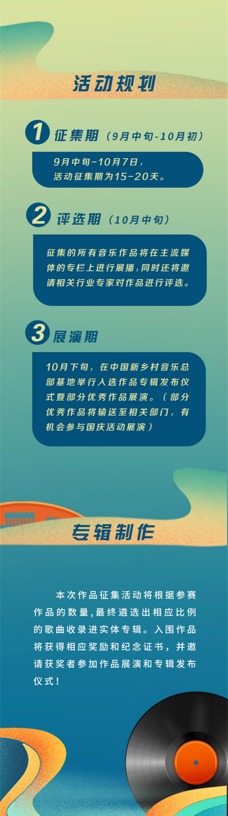活動(dòng)自2021年9月起至2021年10月,分三個(gè)階段:(一)9月啟動(dòng)征集,面向全市音樂(lè)人、音樂(lè)愛(ài)好者、各相關(guān)機(jī)構(gòu)下發(fā)征集歌曲創(chuàng)作通知,歌曲形式鼓勵(lì)創(chuàng)新。(二)10月中旬,征集的所有音樂(lè)作品將在主流媒體的專(zhuān)欄上進(jìn)行展播,邀請(qǐng)各級(jí)音樂(lè)專(zhuān)家進(jìn)行優(yōu)秀作品評(píng)選。(三)10月下旬,在中國(guó)新鄉(xiāng)村音樂(lè)總部基地舉行入選作品專(zhuān)輯發(fā)布儀式暨部分優(yōu)秀作品展演,并遴選出相應(yīng)比例的歌曲收錄進(jìn)實(shí)體專(zhuān)輯。