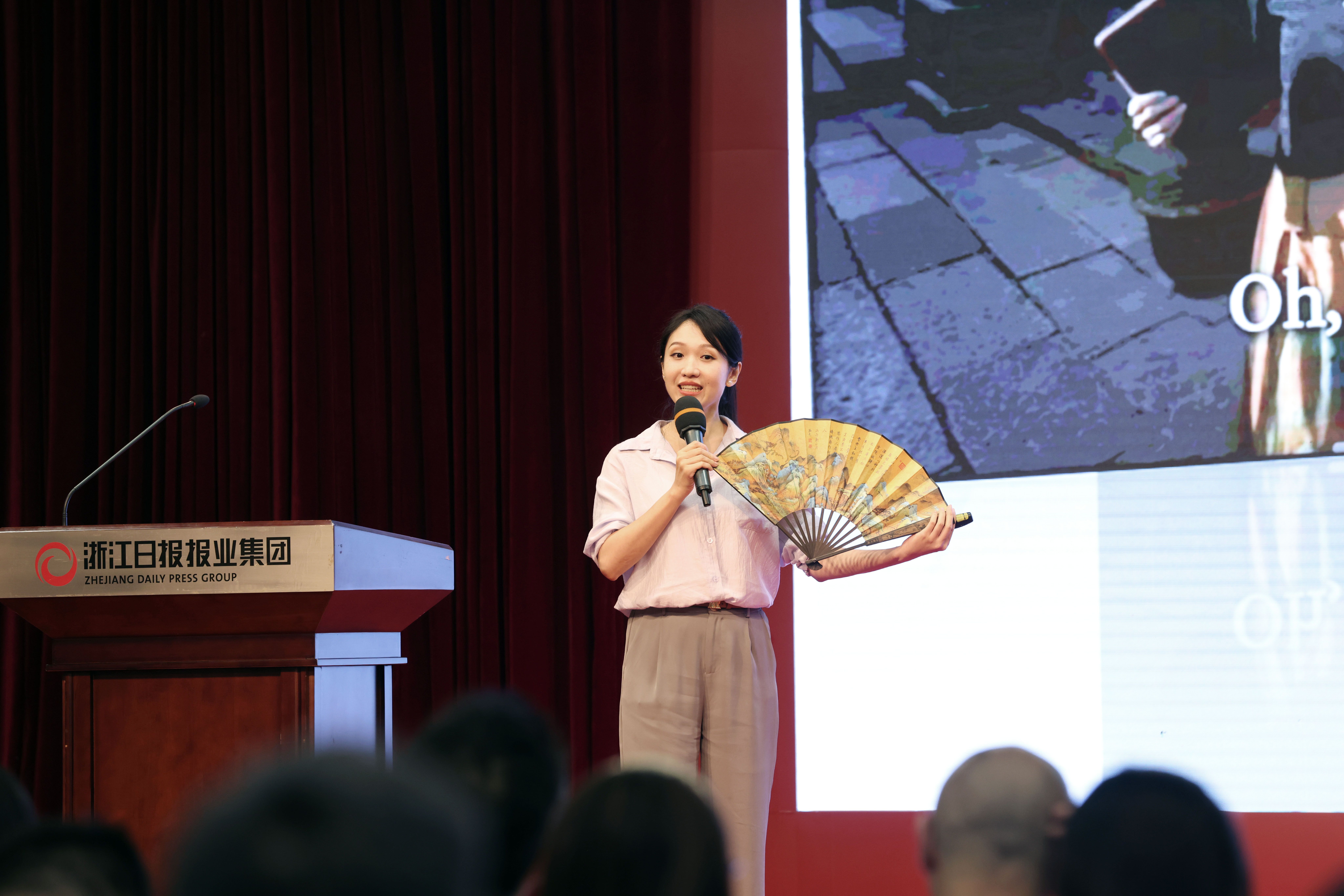 比賽現(xiàn)場,聲情并茂的演講,以小見大的視角,有力展示了我省新聞工作者不斷踐行“四力”、積極以新聞推動社會進(jìn)步的使命擔(dān)當(dāng)。他們當(dāng)中,有人熱情向世界傳播浙江好故事,有人以思想為載體聯(lián)結(jié)今昔,還有人用新技術(shù)賦能追逐著媒體變革浪潮……金獎得主劉嬌一是嘉興市新聞傳媒中心的英漢雙語主播,她手持一把繪有宋代名畫《千里江山圖》的折扇走上舞臺。這把折扇,見證了她用英語向31國32位駐華使節(jié)傳遞紅船精神的經(jīng)歷,也被帶到過世界互聯(lián)網(wǎng)大會·烏鎮(zhèn)峰會的現(xiàn)場,讓外國友人感受到中國文化魅力。浙江日報評論員張萍坦言,新聞評論者要努力抵達(dá)“思想的現(xiàn)場”。她以撰寫的“第一視點”欄目稿《習(xí)近平的四副春聯(lián)》為例,展示了如何“重回”現(xiàn)場找到“四副春聯(lián)”對當(dāng)下觀照價值的破局啟示。浙江廣播電視集團(tuán)浙江之聲記者喬英明,這位95后講述了自己從播音生向“AI大神”轉(zhuǎn)變的成長之路,他說:“媒體人的安全感來自不斷突破邊界的勇氣?!?/span>