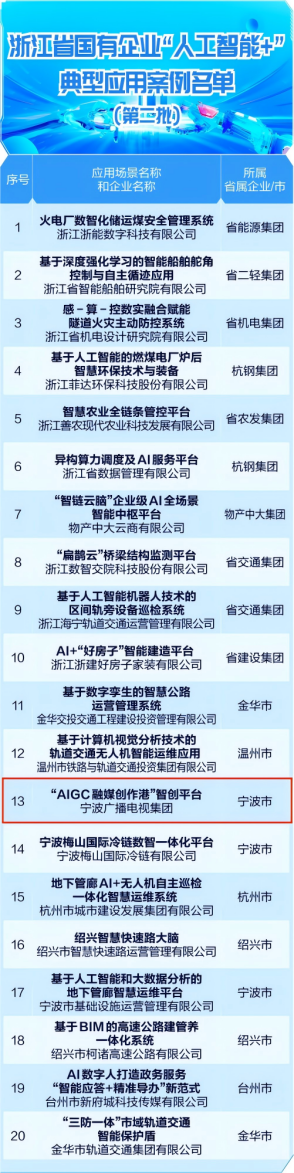 9月25日,浙江省國(guó)資委發(fā)布第二批20個(gè)“人工智能+”典型應(yīng)用案例名單,寧波廣電集團(tuán)打造的“AIGC融媒創(chuàng)作港”智創(chuàng)平臺(tái)憑借其在傳媒領(lǐng)域的創(chuàng)新實(shí)踐與顯著成效成功入選。