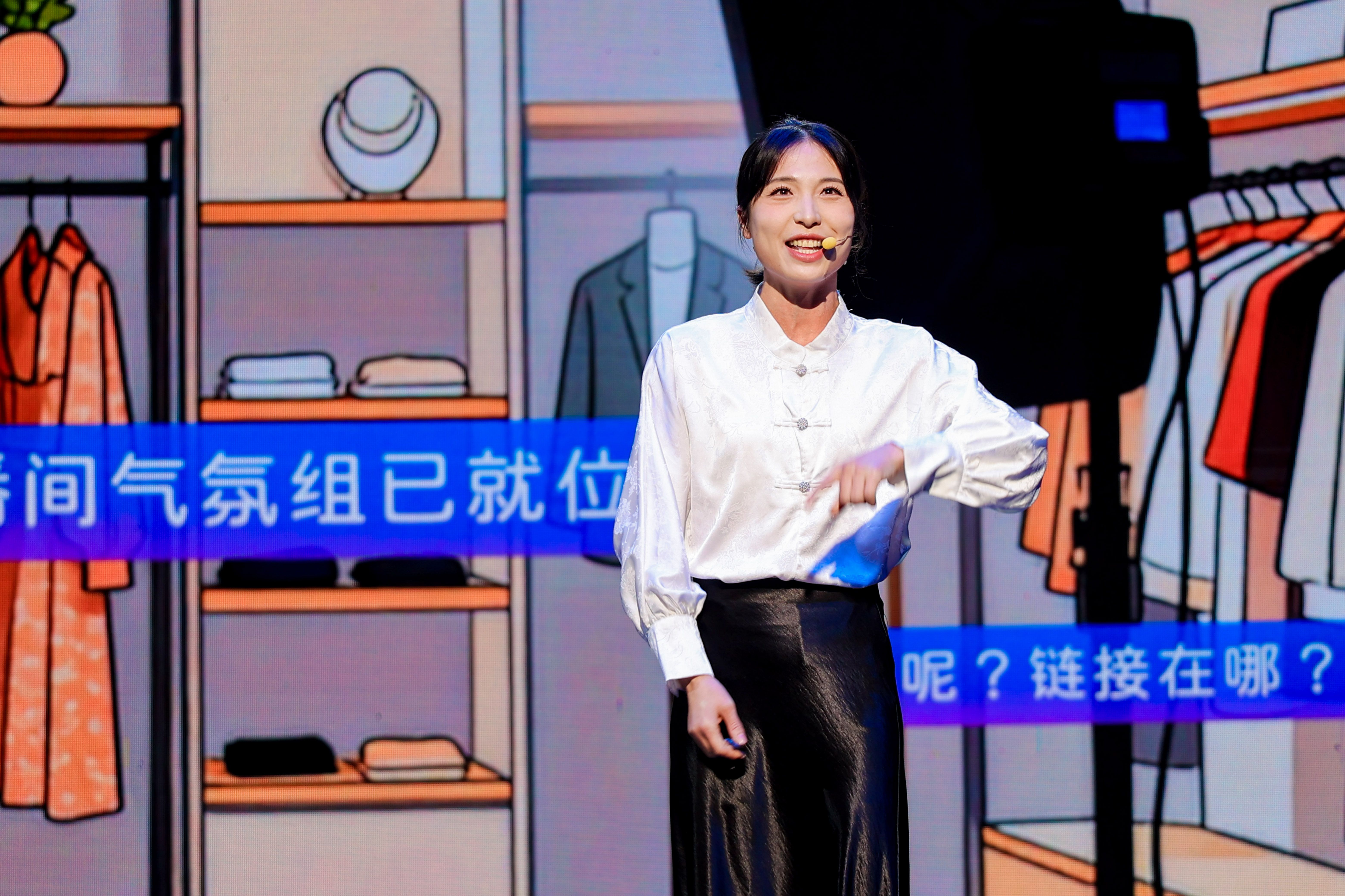 電商主播韓佳丹進(jìn)行“舞臺(tái)虛擬直播間”展示