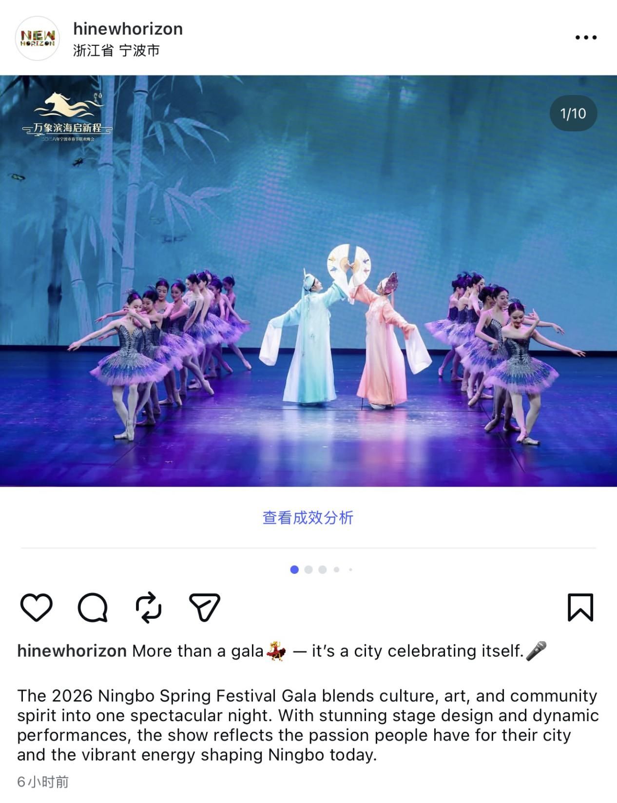 國際傳播方面,提前策劃聯(lián)系歐洲寧波總商會會長李永平、廈門基金會行政委員會副主席鐘怡等海外寧波人、在甬外籍人士等,通過廣電國傳賬號第一時間發(fā)布寧波春晚的反響報道《Foreigners' Real Reactions to the Ningbo Spring Festival Gala被中式浪漫 “拿捏”!外國朋友們的反應太真實了》、《When Ballet Meets Butterfly Lovers—A Harmony of Eastern and Western Aesthetics 當芭蕾跳進《梁?!?歐洲寧波總商會會長李永平點贊同頻共振的中西美學》等,成功推動本土春節(jié)文化的創(chuàng)新表達與國際化傳播。